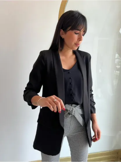 Esta chaqueta de mujer está entre los más top de las prendas de fondo de armario ya que una blazer negra o una blazer blanca nunca pasará de moda. Esta americana de mujer lleva forro en su interior y sus manguitas van fruncidas para darle un estilo diferente junto a sus falsos bolsillos que le dan un estilo chic. Además, lleva hombreras para que tu figura se vea más marcada.