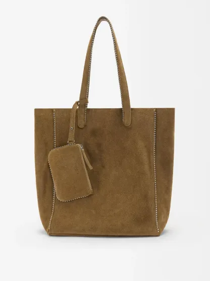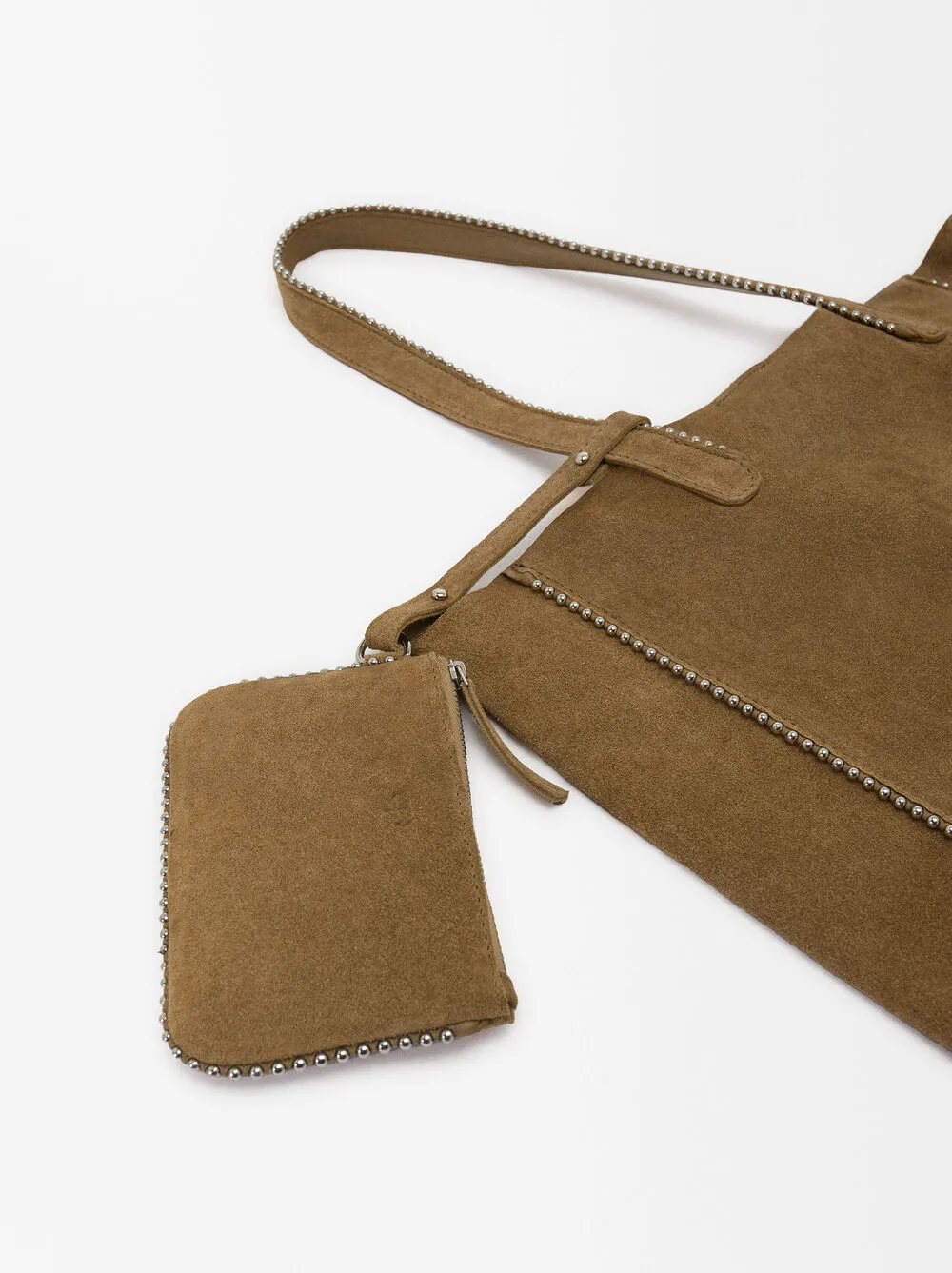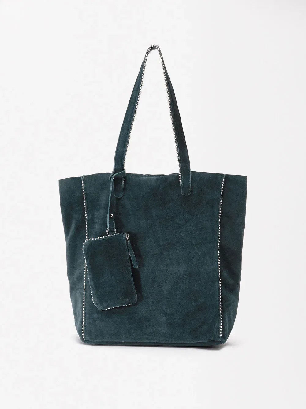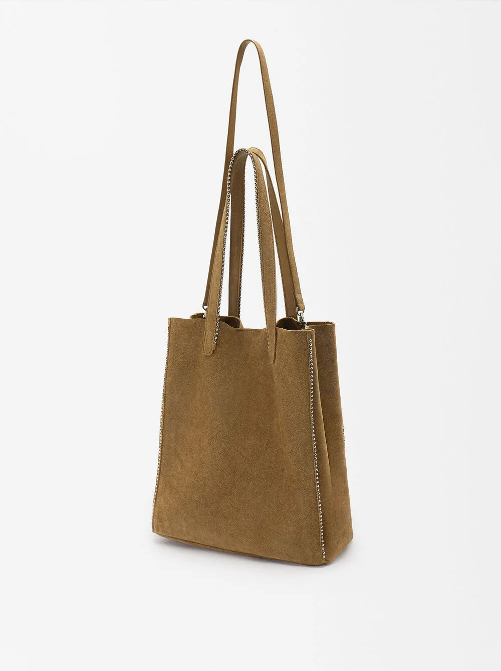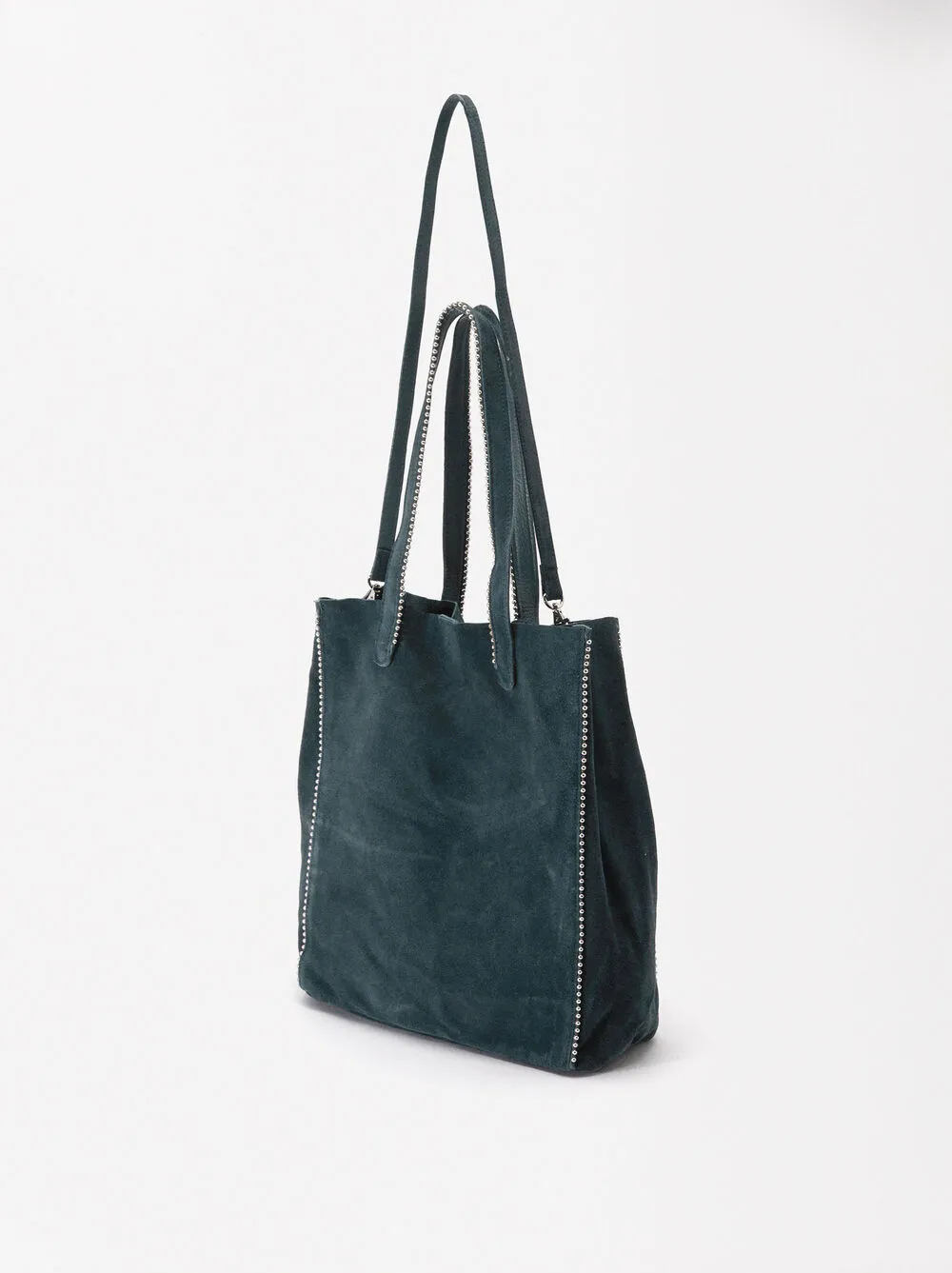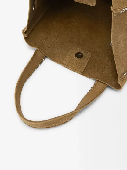 Bolso shopper de piel serraje con colgante y cierre de imán. Detalle de abalorios en los bordes. Incluye asa extraíble.