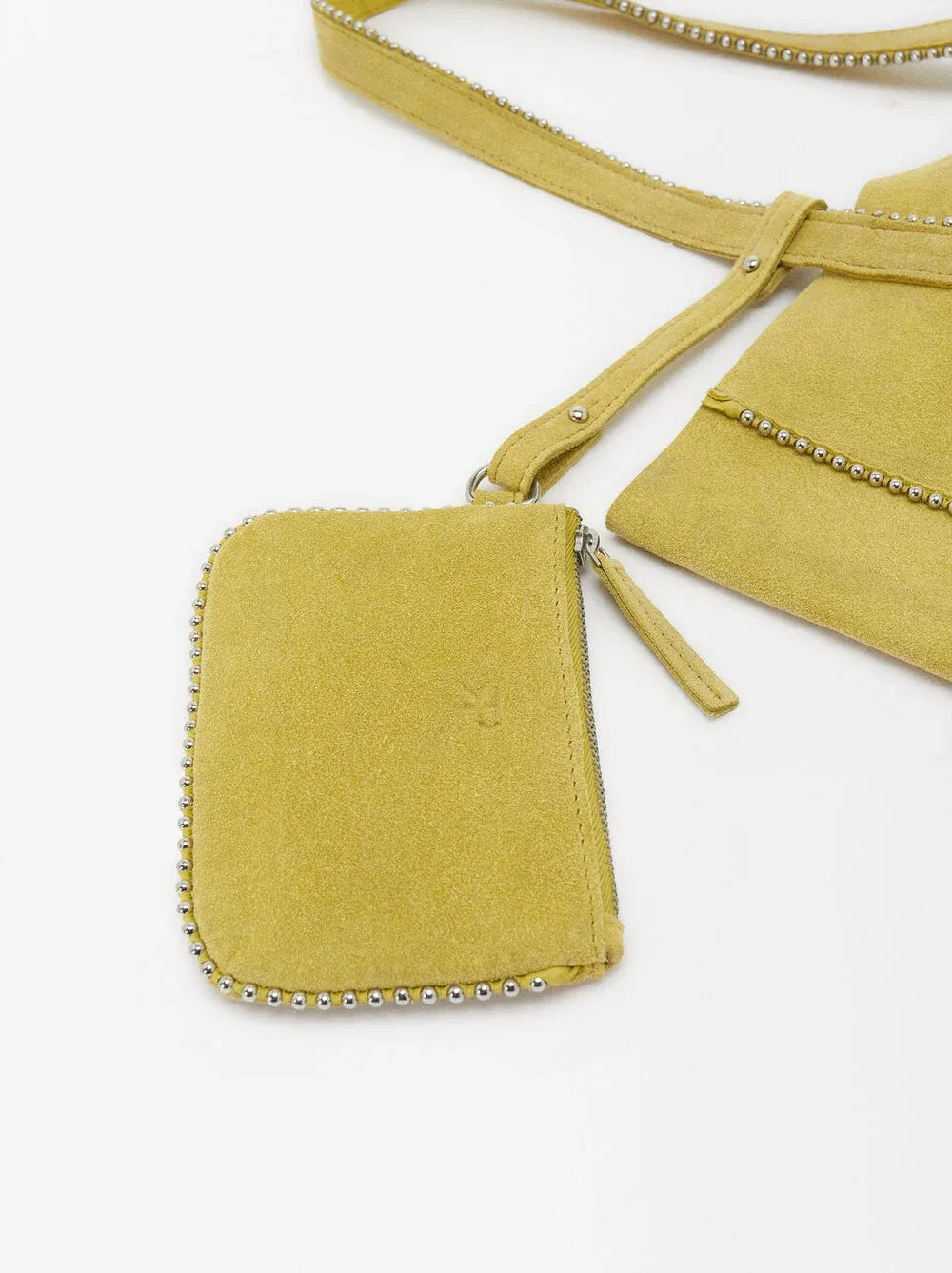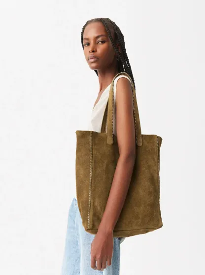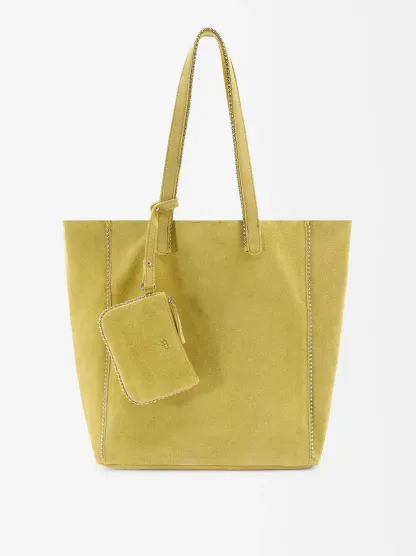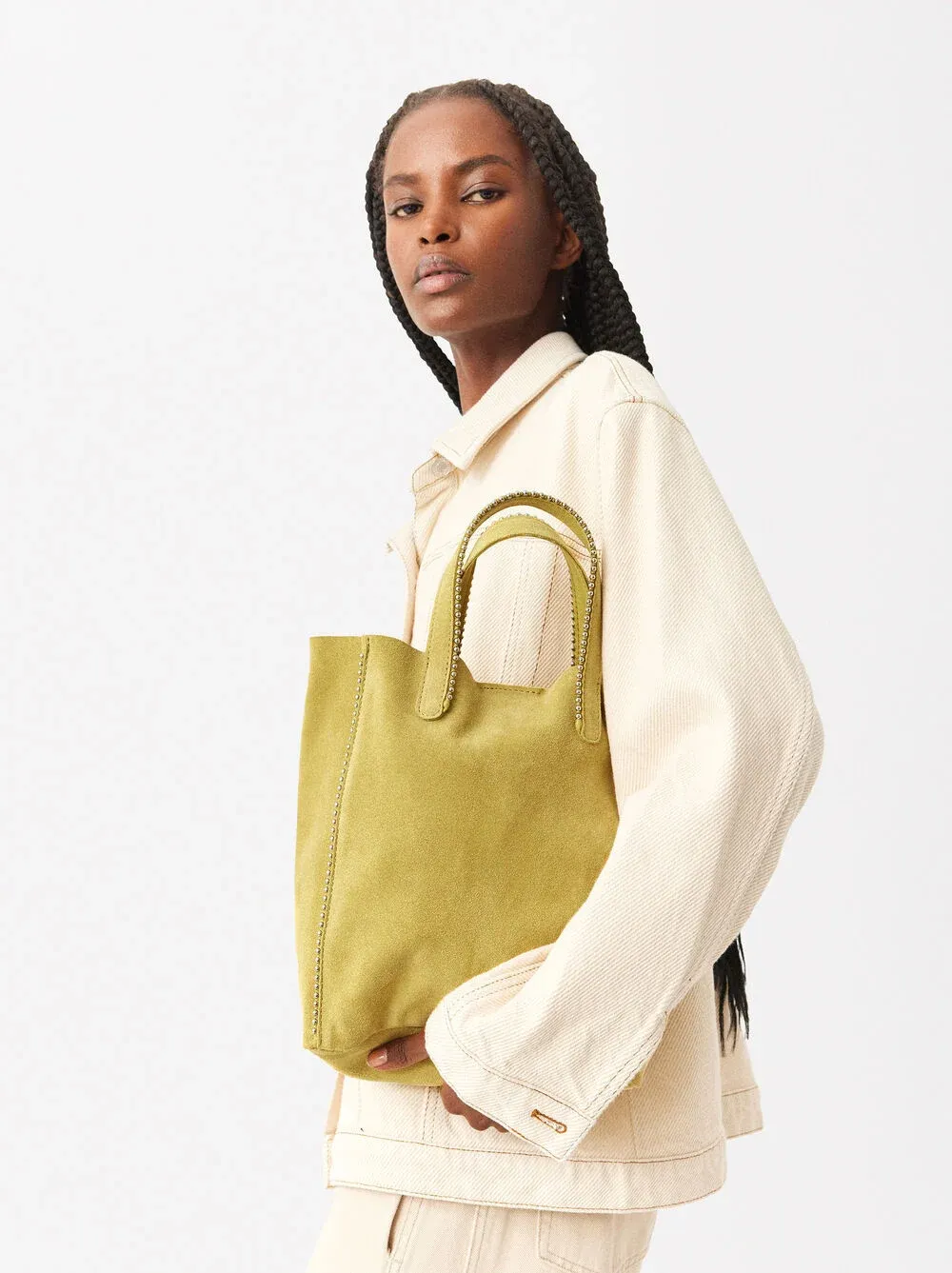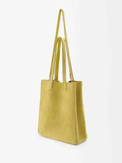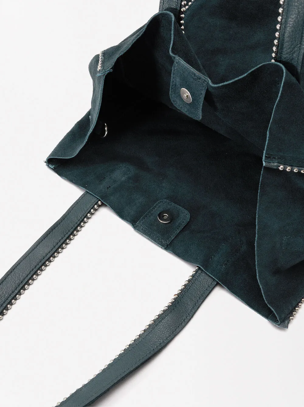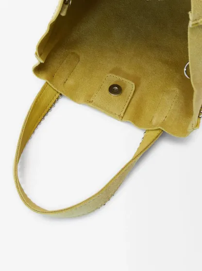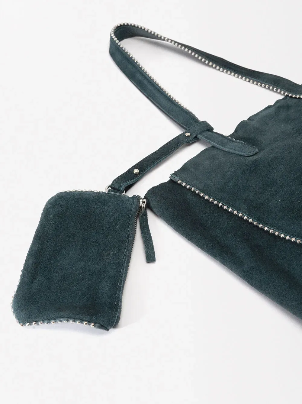 Bolso shopper de piel serraje con colgante y cierre de imán. Detalle de abalorios en los bordes. Incluye asa extraíble.