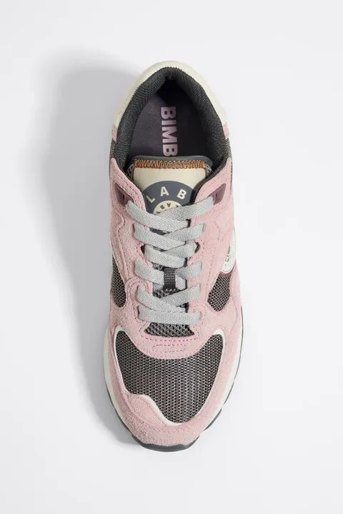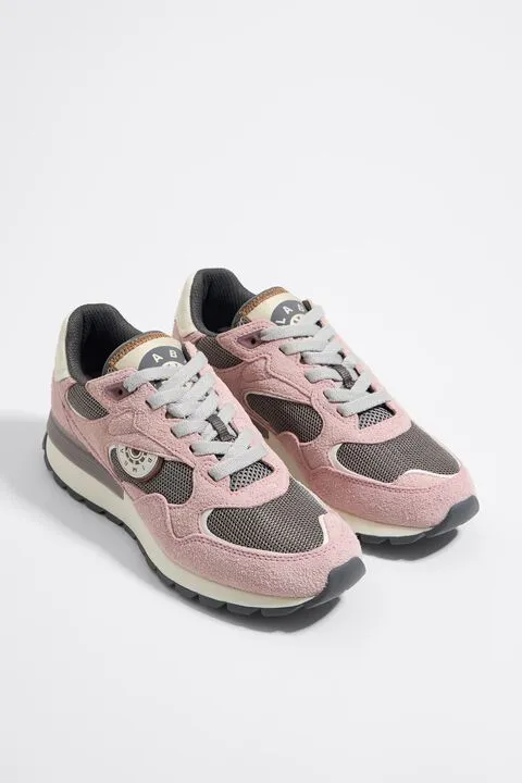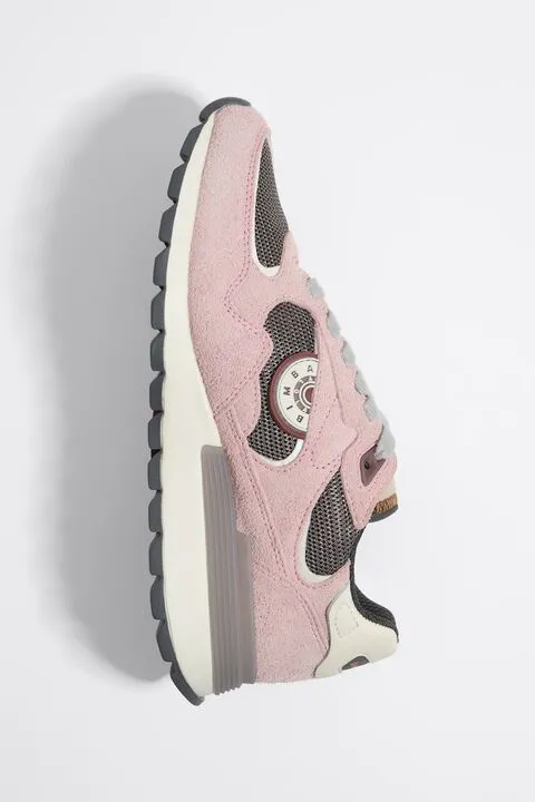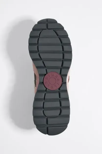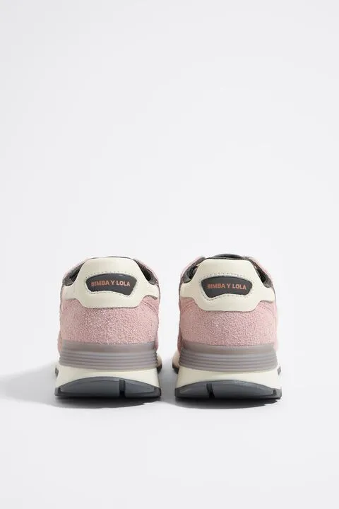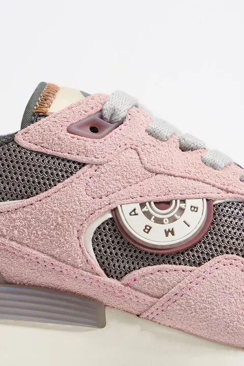 Deportiva jogger de serraje peludo combinado con tejidos técnicos en color rosa. Pieza logotipada con efecto reflectante en el talón, logo de silicona en el lateral y etiqueta con logo Chimo en la lengüeta. Estabilizador personalizado y piso bicolor con acabado dentado.