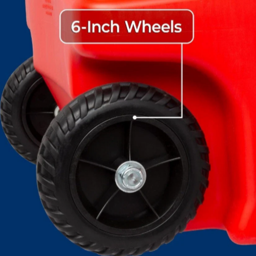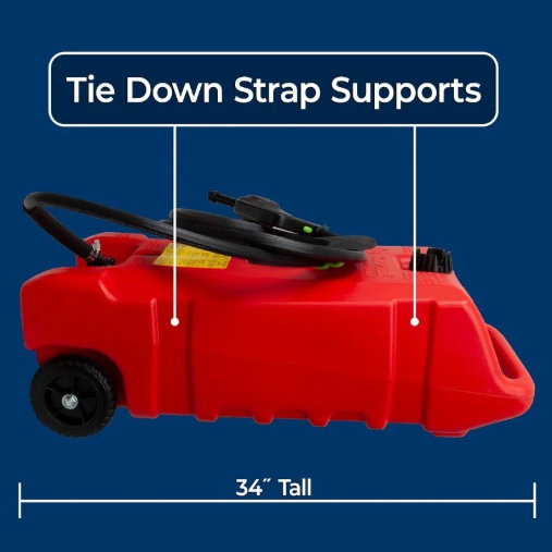 ✔️ CONVENIENT PORTABLE FUEL TANK: Sturdy 6" wheels with rugged tread allow the fuel caddy to go where needed; Easily store and protect the hose with included storage hanger; Additional features include a nozzle drip cap, nozzle/hose clips, and strap supports.