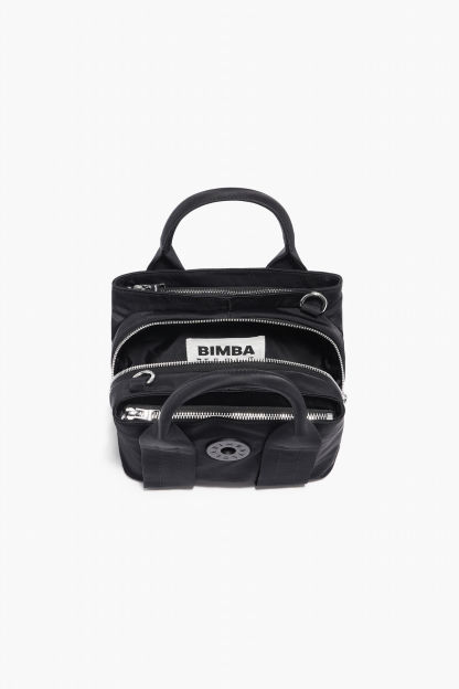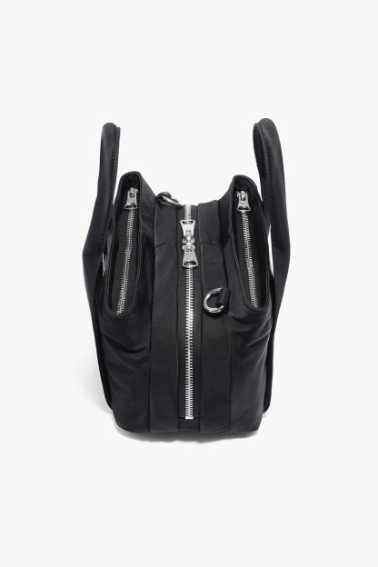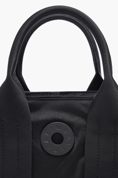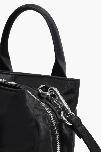 Bolso tote de nylon en color negro. Modelo de tamaño XS con asa de mano y de hombro extraíble. Exterior personalizado con logo lacado. Cierre de cremallera.