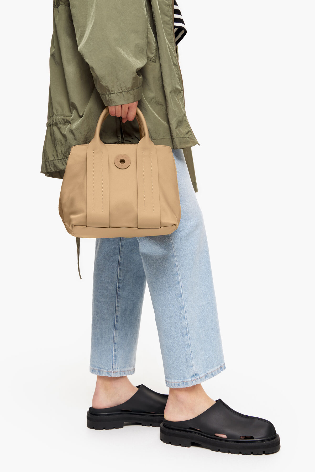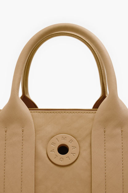 Bolso tote de nylon en color tostado. Modelo de tamaño pequeño con cierre de cremallera y asa logotipada extraíble. Exterior personalizado con Logo Chimo esmaltado.