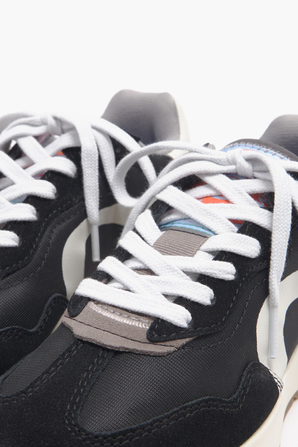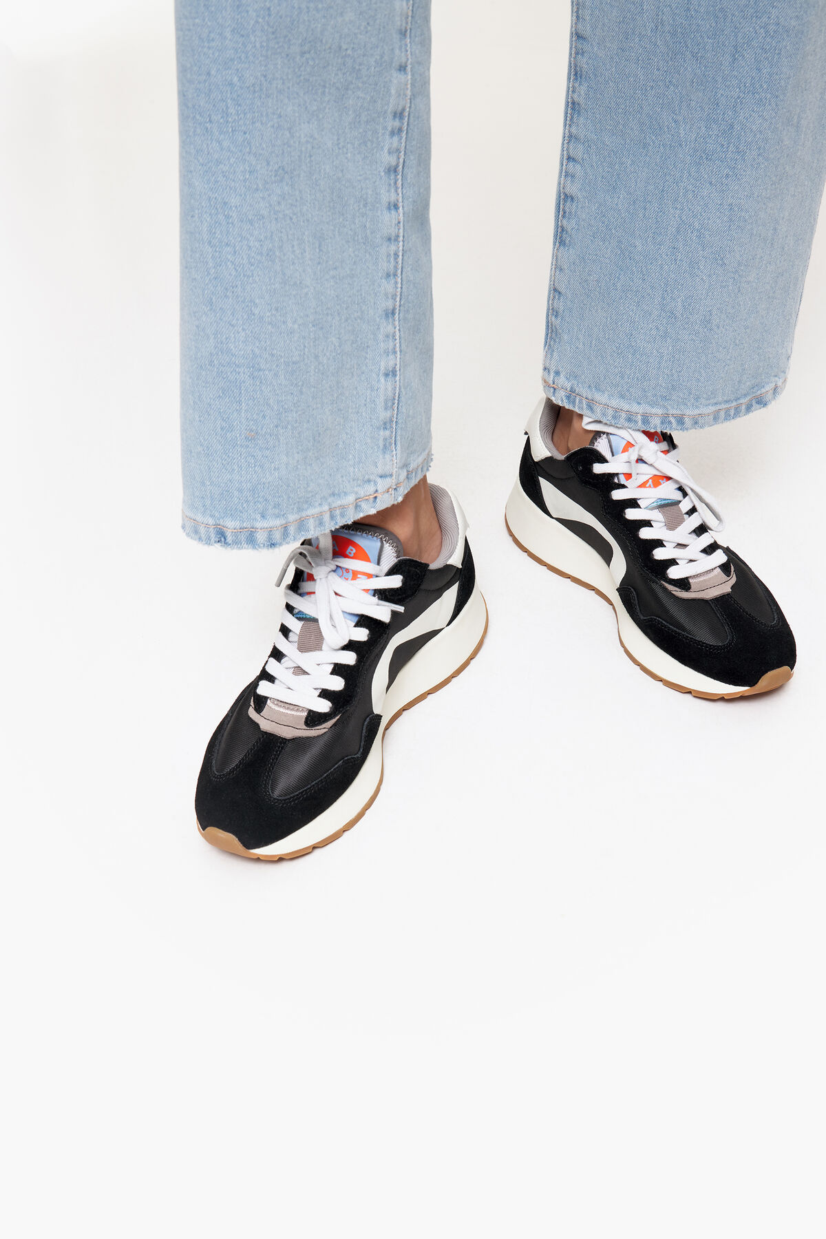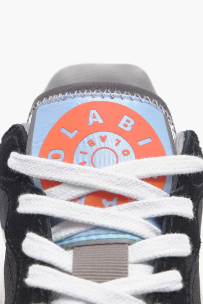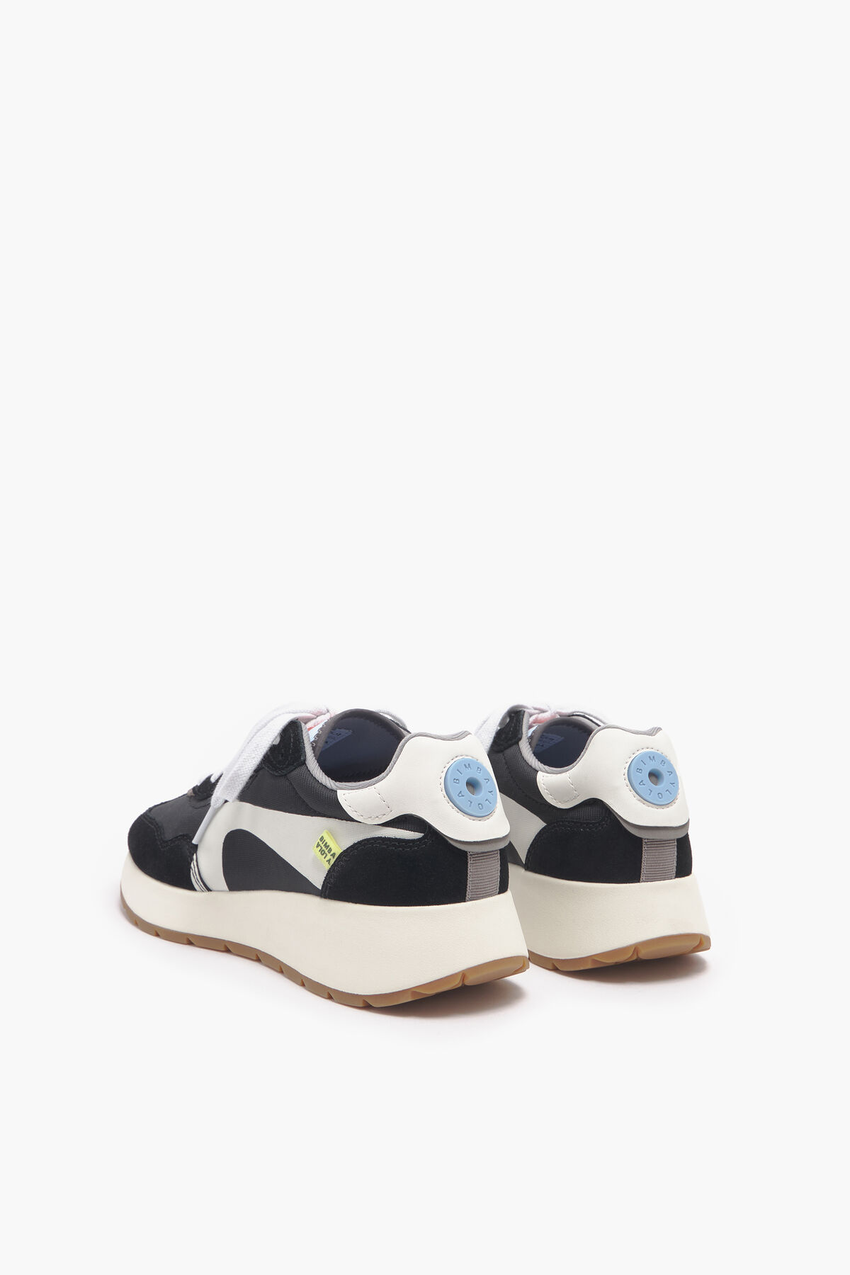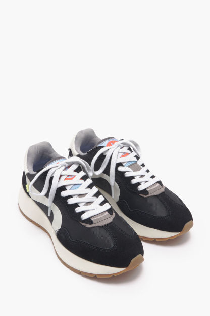 Deportiva lifestyle en color negro. Modelo con piezas de piel combinadas con serraje, tejidos técnicos y gráficos laterales a contraste. Modelo personalizado con etiqueta textil en los laterales y Logo Chimo trasero. Plantilla logotipada y piso bicolor personalizado.