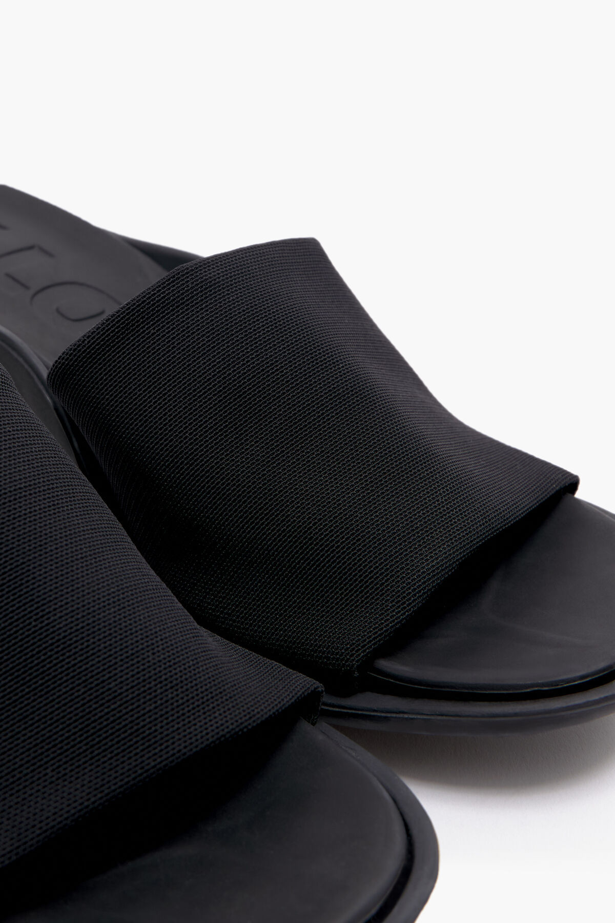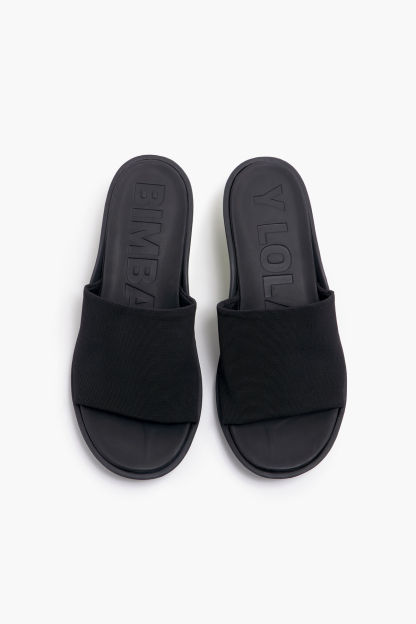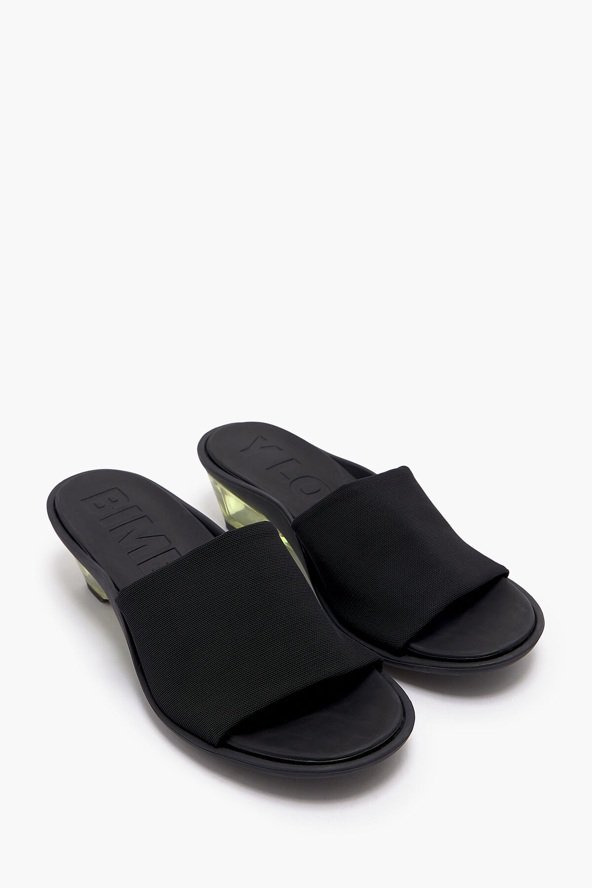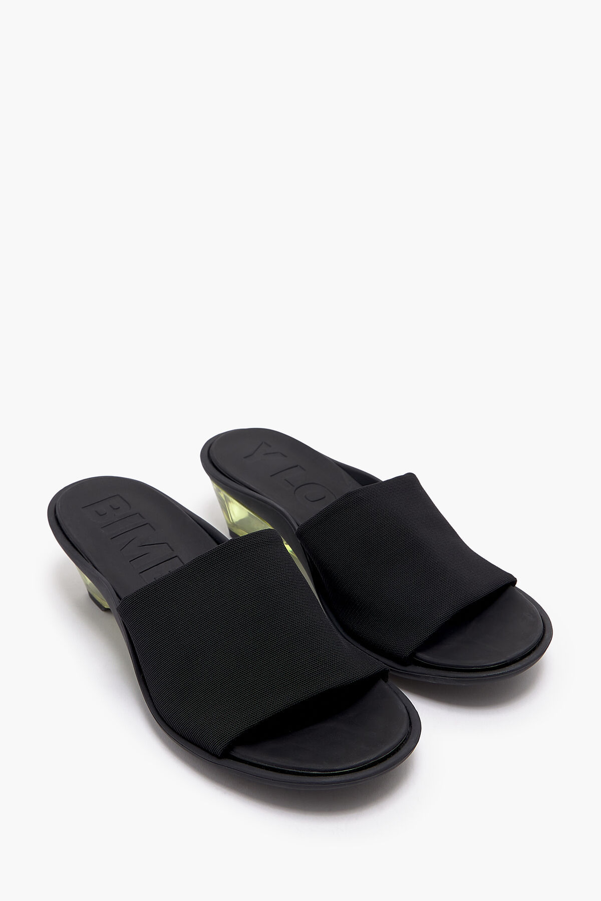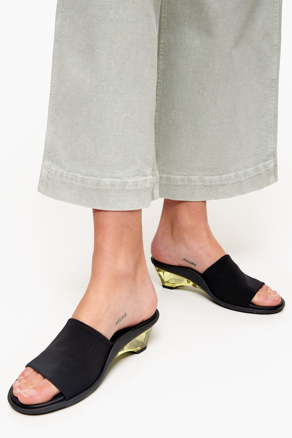 Cuña de rejilla técnica en color negro. Modelo con planta anatómica con superlogo y tacón transparente en color amarillo.