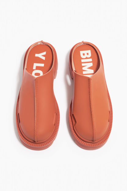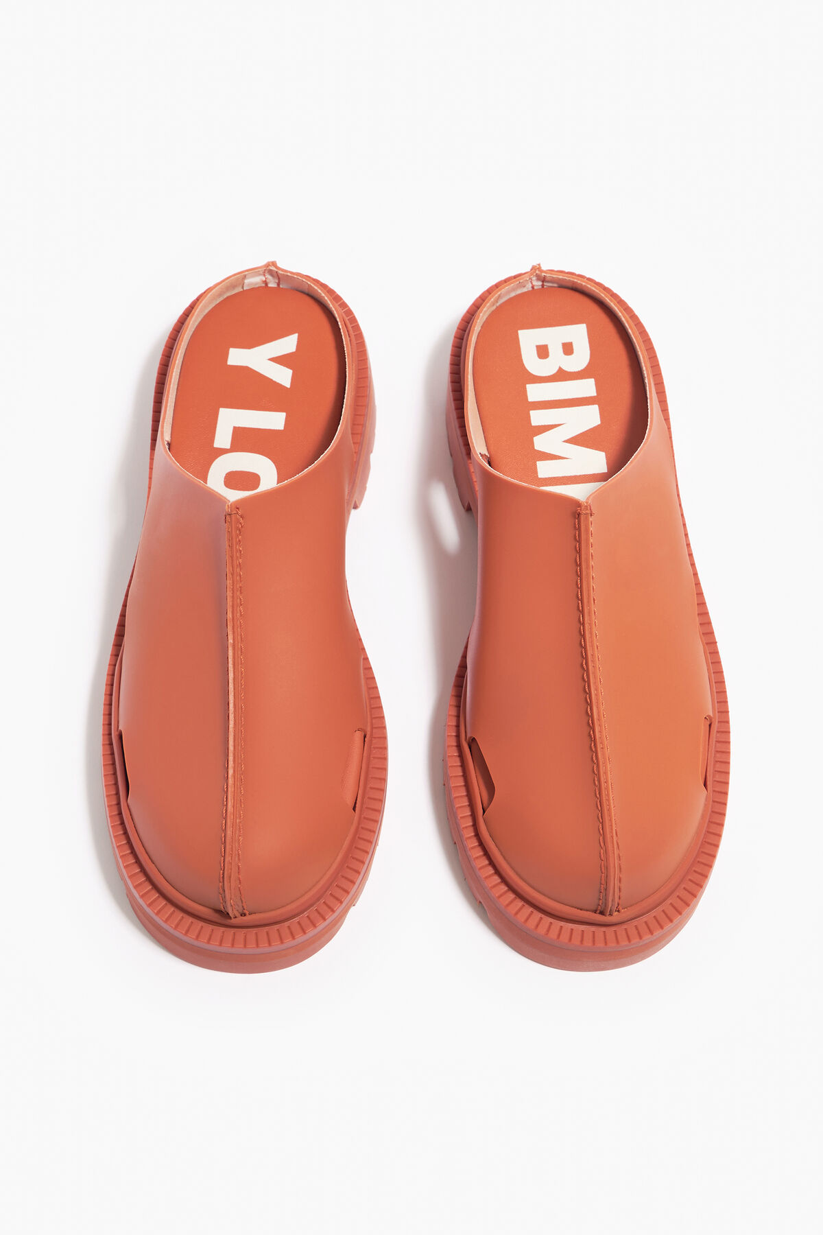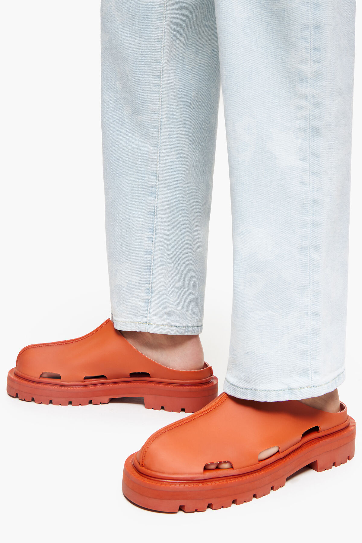 Zuego engomado en color naranja. Modelo de punta redonda con plantilla de piel logotipada y piso inyectado personalizado.