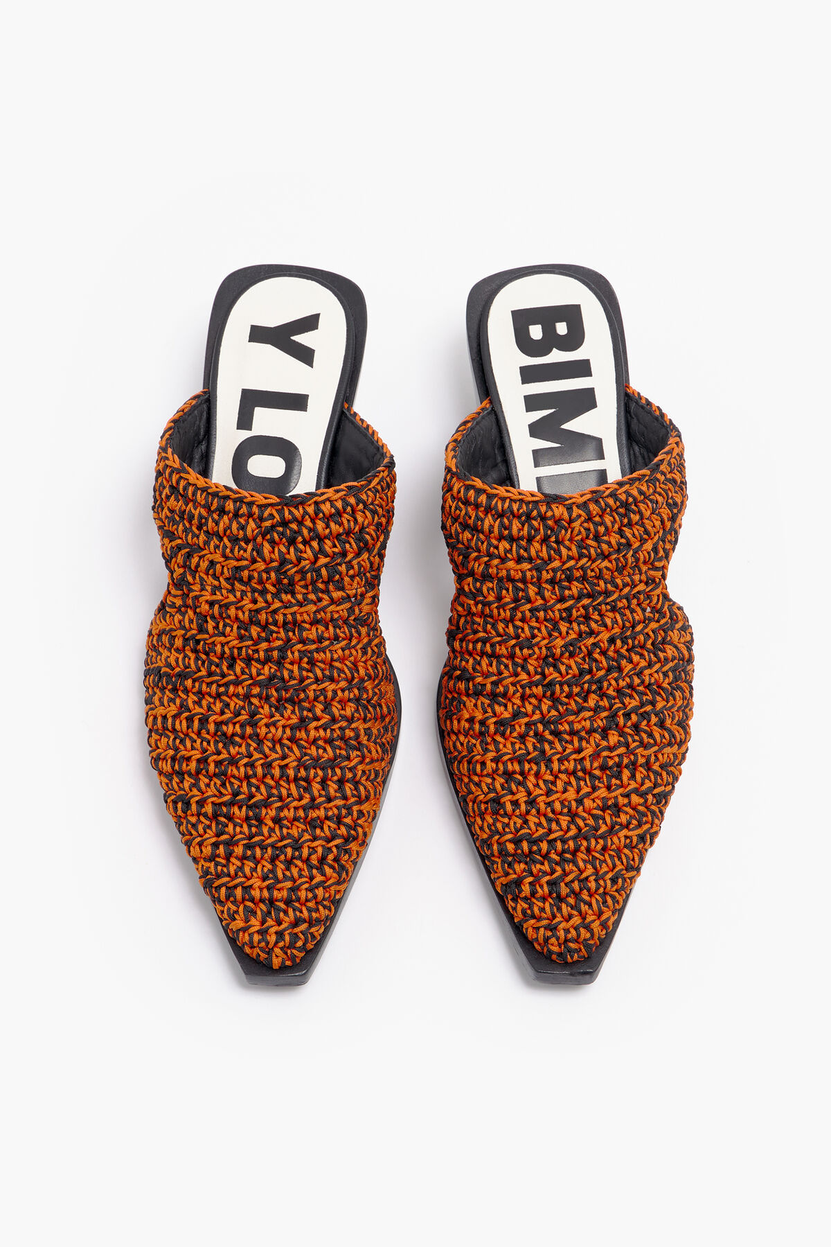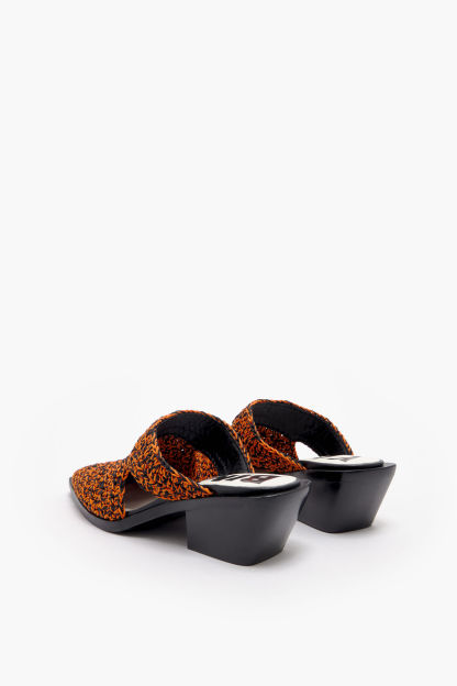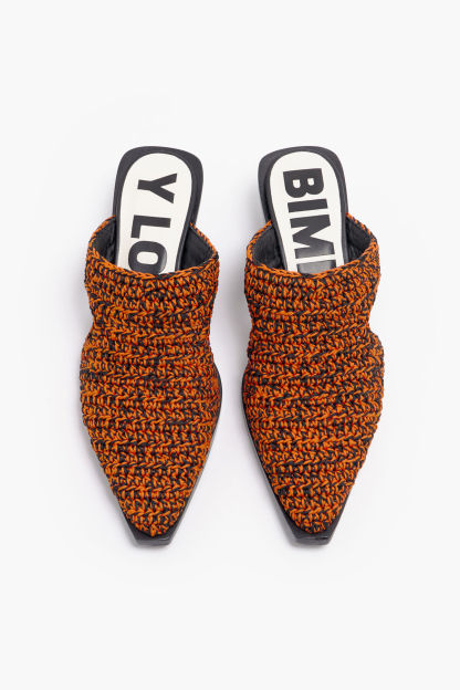 Zueco de crochet hecho a mano en color naranja. Modelo de tacón acabado en punta, plantilla logotipada a contraste y piso logotipado.
