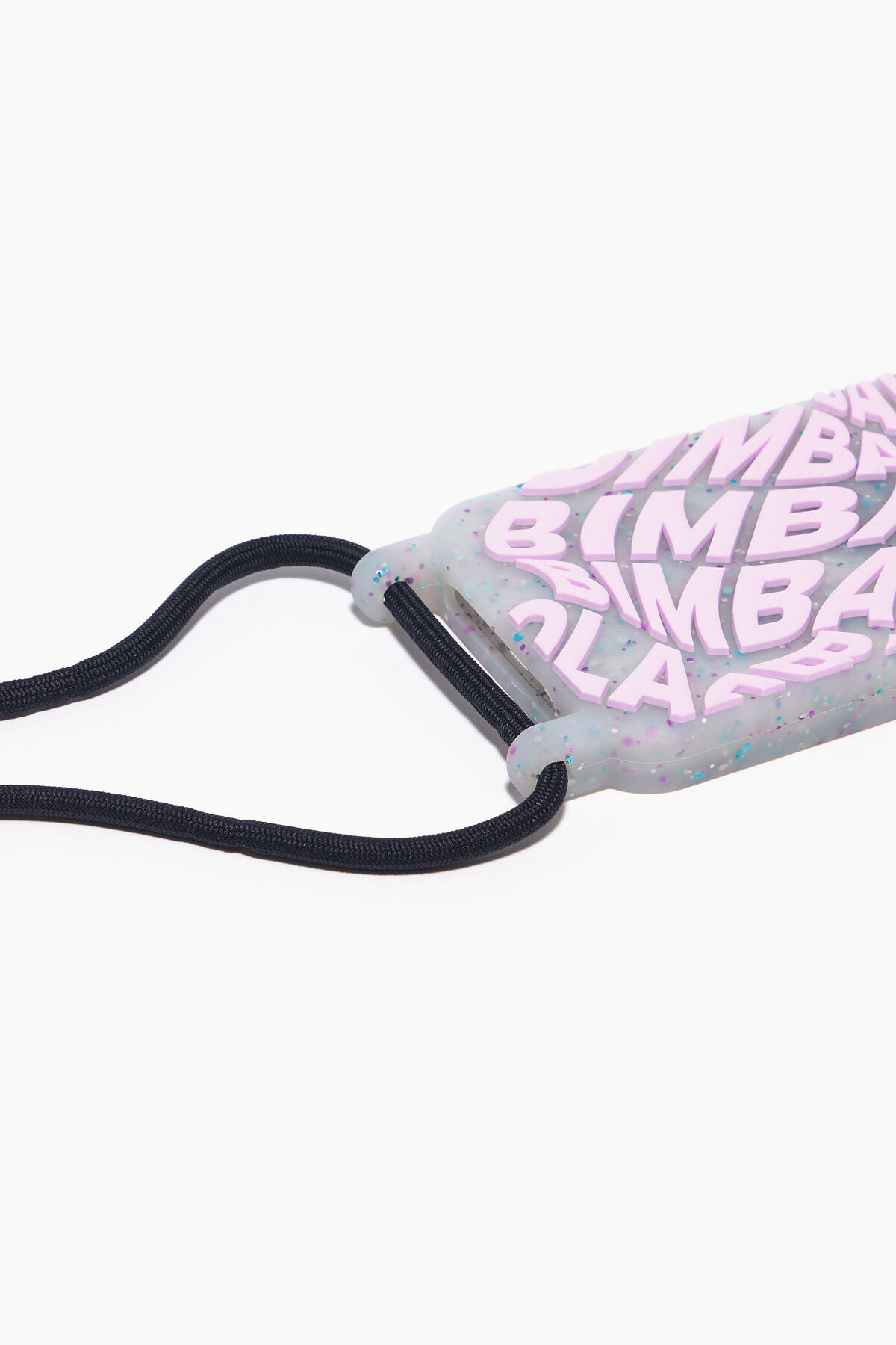 Funda para iPhone 13 Pro de goma transparente con efecto confeti y logo en color lila. Modelo blando con cabo en y pieza ajustadora metálica en color negro.