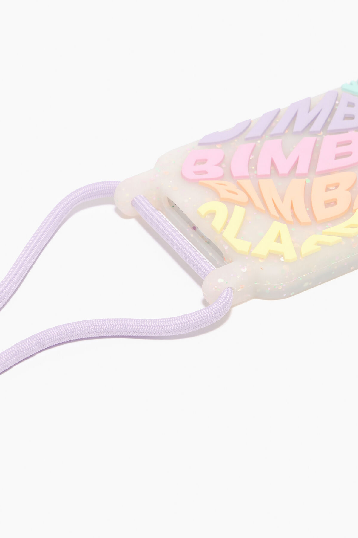 Funda para iPhone 14 Pro Max con efecto confeti y logo multicolor. Modelo con cabo y pieza ajustadora metálica.