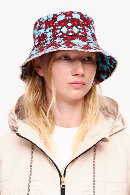 Gorro de algodón estilo bucket con print Flowers Full en color azul. Modelo personalizado con logo en la etiqueta y borde desflecado.