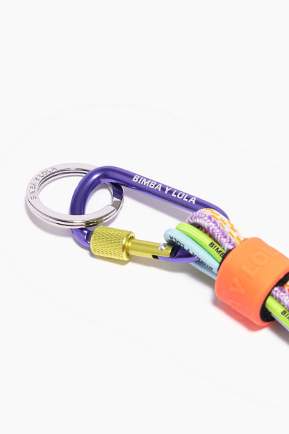 Llavero multicolor de cuerdas y dados con las letras BIMBA. Modelo con mosquetón azul y anilla para llaves plateada.