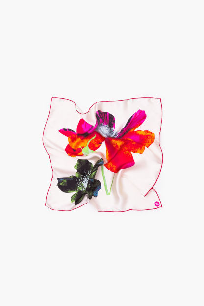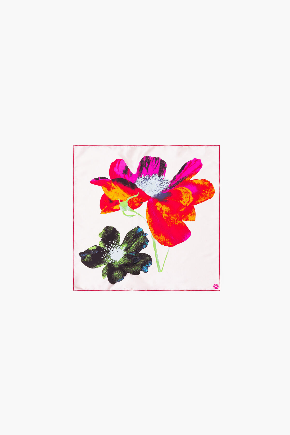 Pañuelo cuadrado de seda con estampado de flores XL sobre fondo blanco roto.