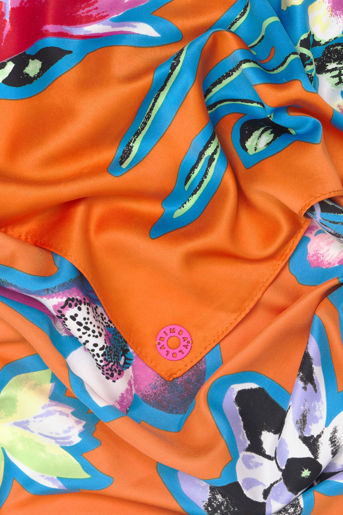 Pañuelo cuadrado con estampado de flores con contornos XL en contraste sobre fondo naranja.