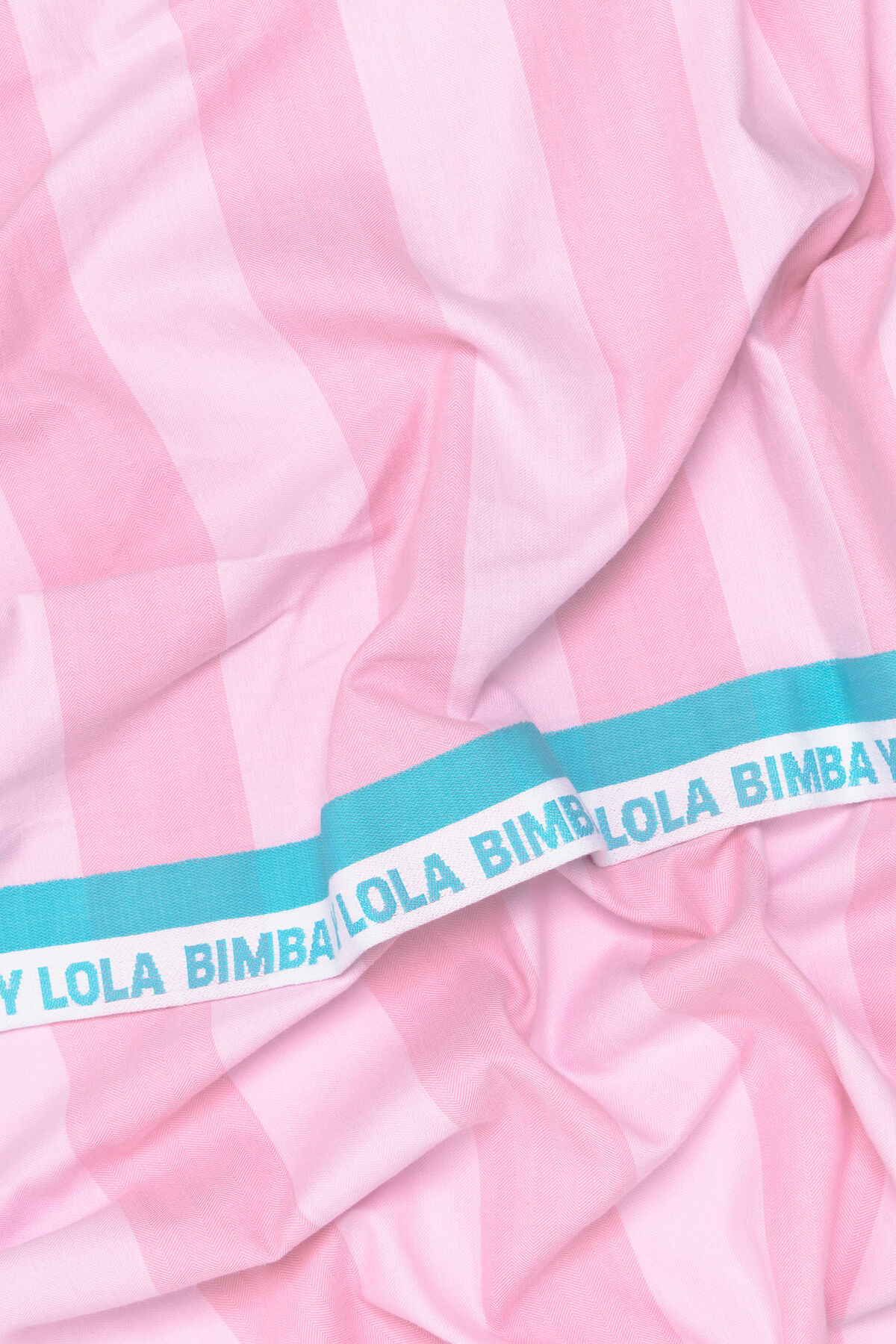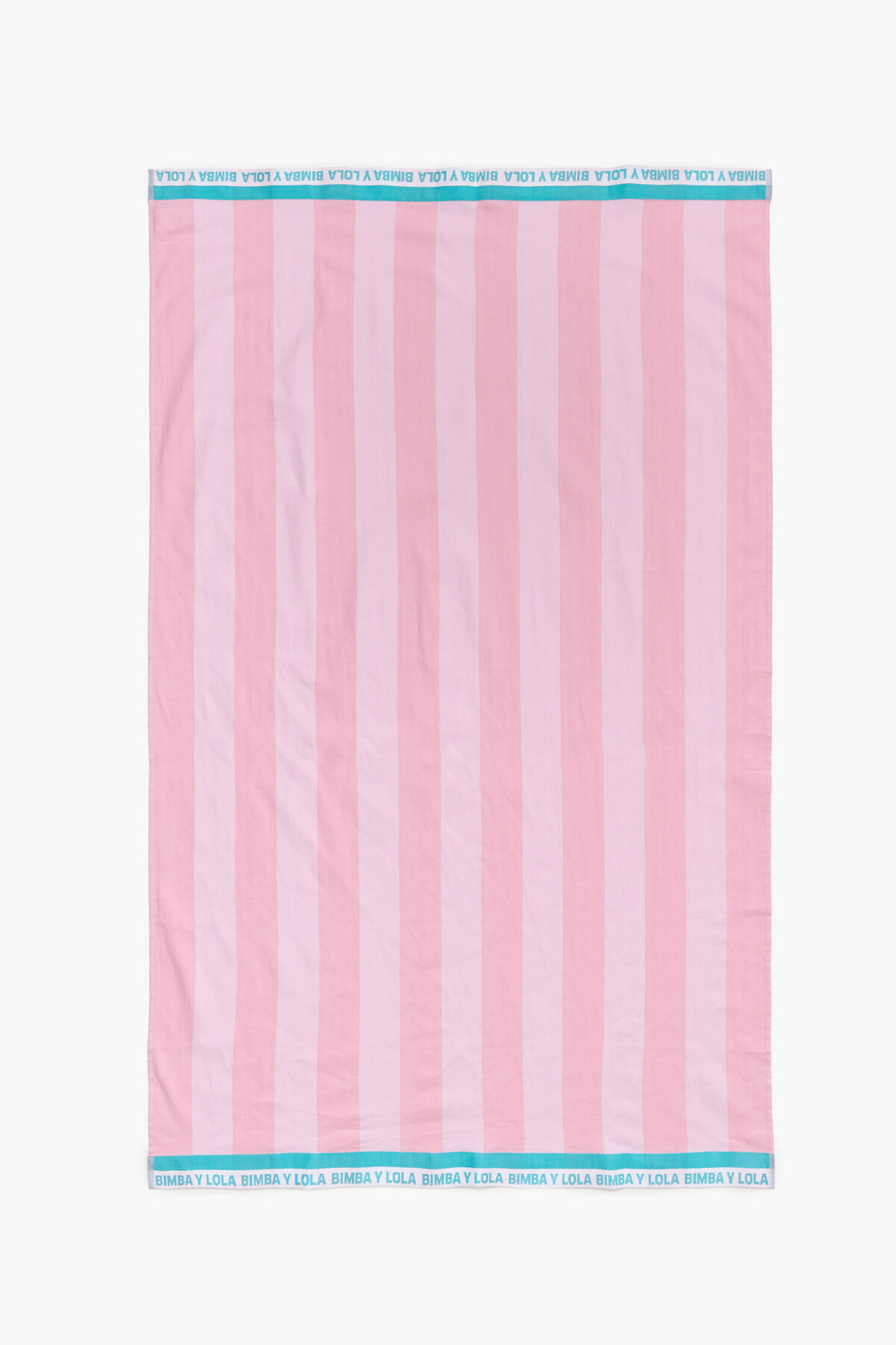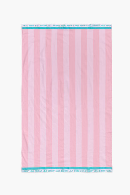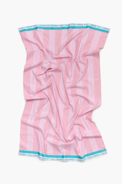Toalla a rayas rosas y blancas. Modelo personalizado con bandas logotipadas en los bordes.