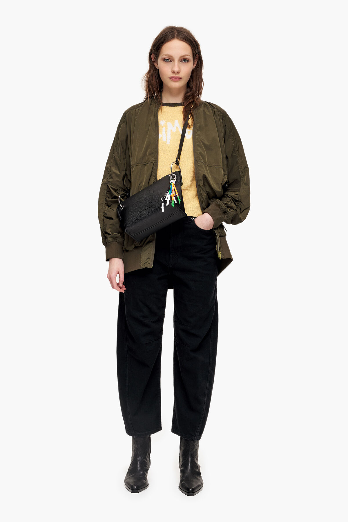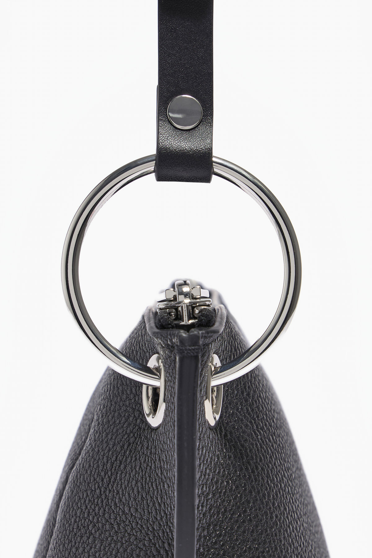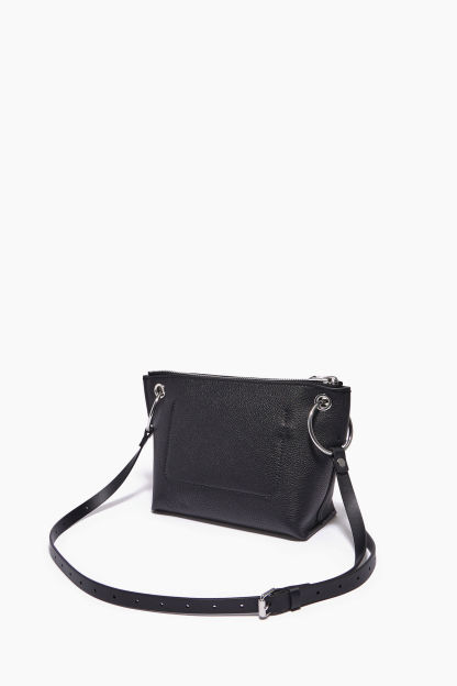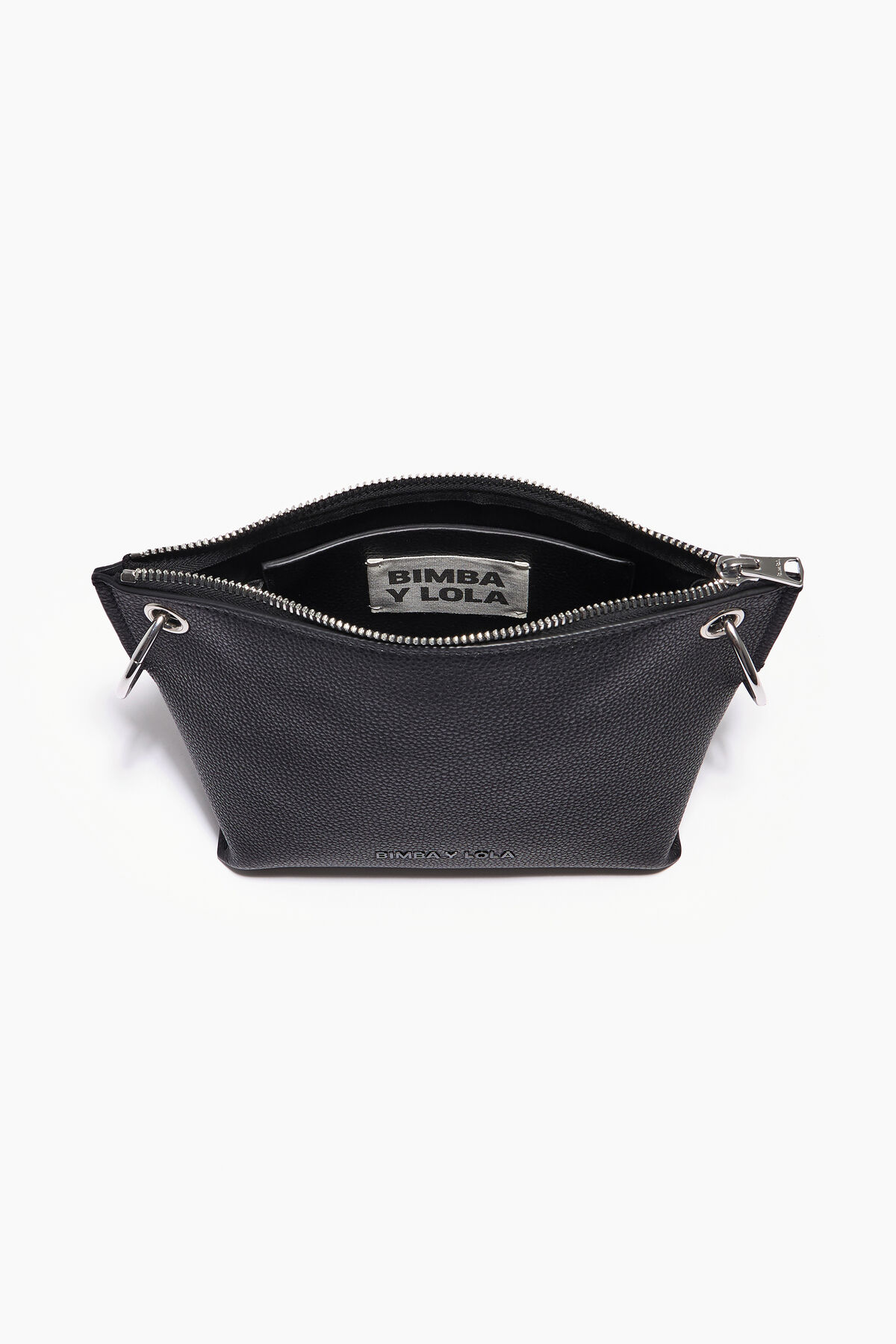 Bolso bandolera de piel en color negro. Modelo de tamaño mediano, cierre de cremallera y asa de piel. Exterior personalizado con logo lacado.