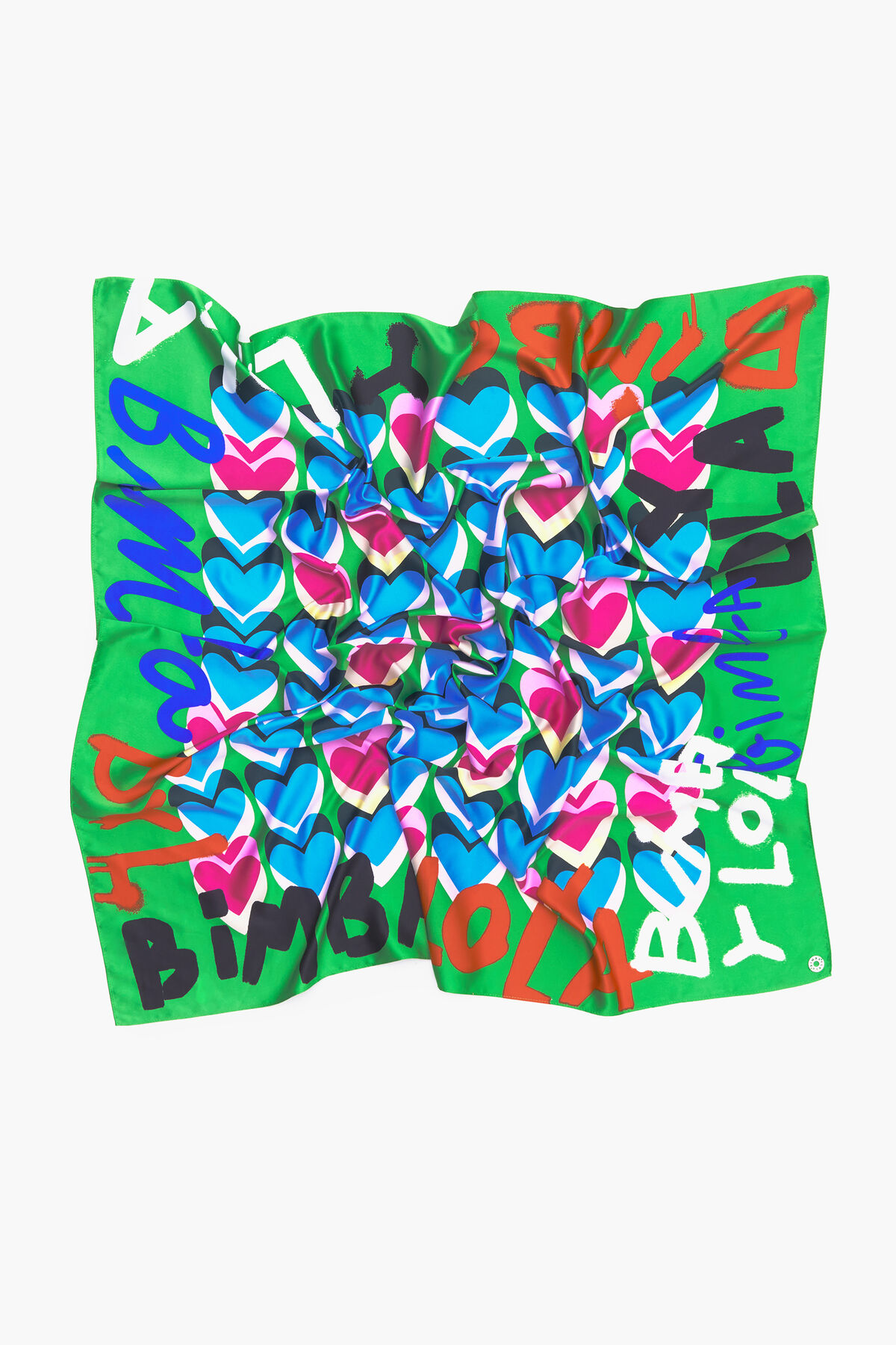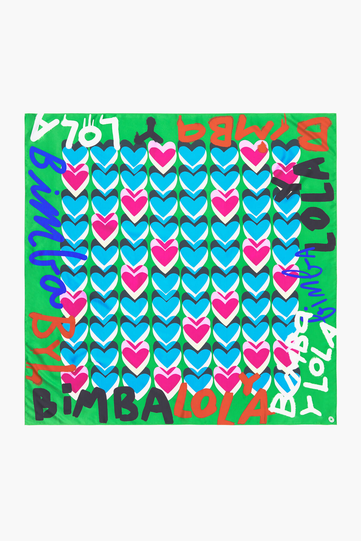 Pañuelo cuadrado con estampado de corazones y marco dibujado con logos estilo grafiti sobre fondo verde. Este modelo contiene 100% Poliéster reciclado.
