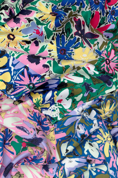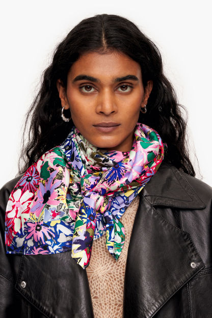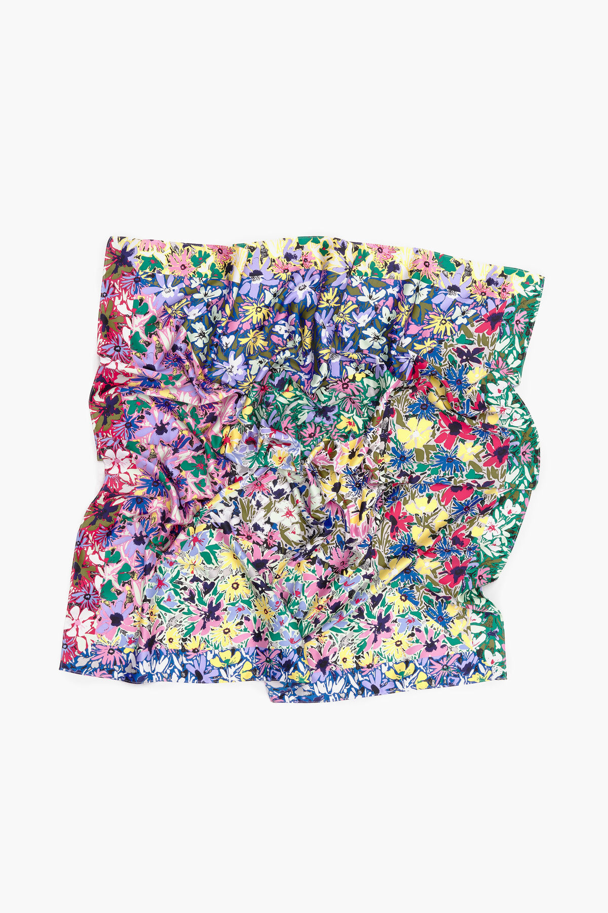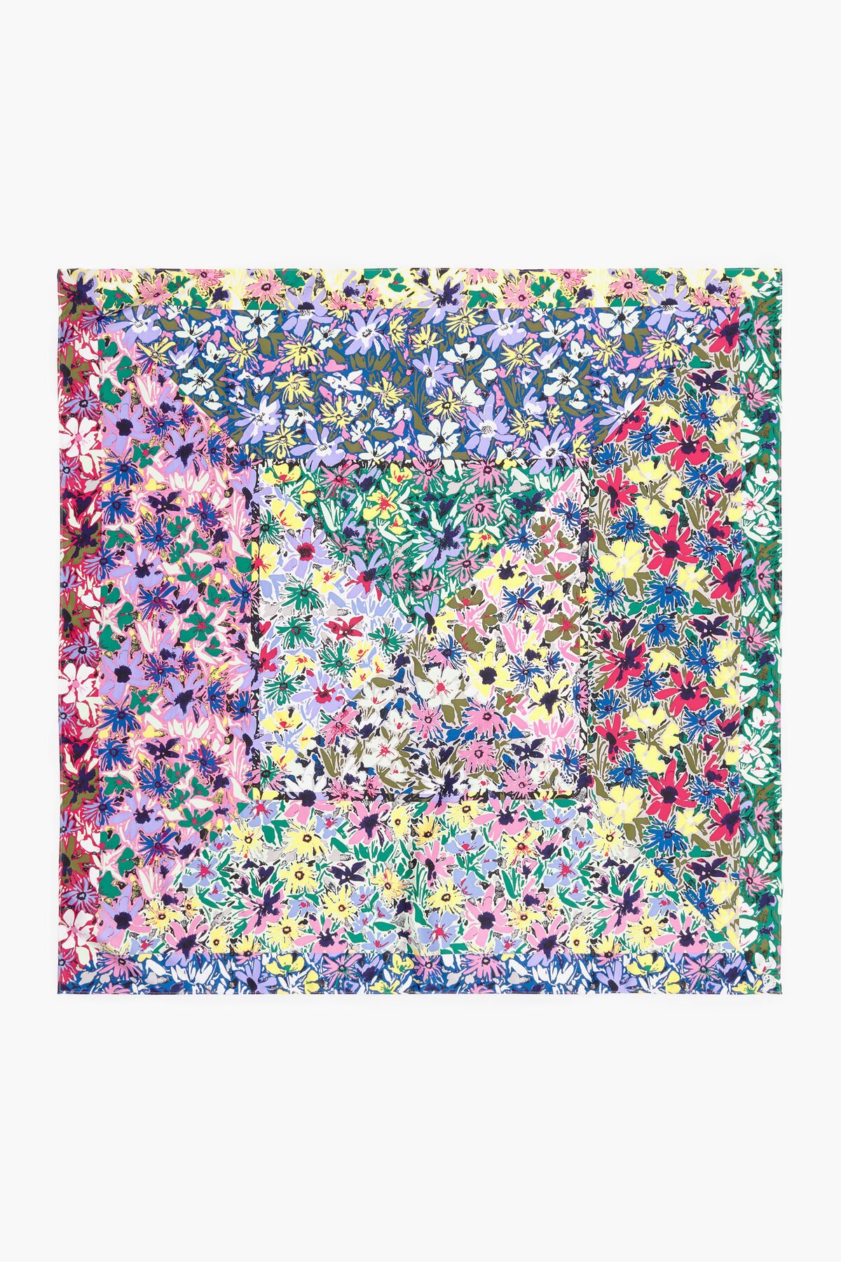 Pañuelo cuadrado con estampado multicolor de flores sobre fondo geométrico. Este modelo contiene 100% Poliéster reciclado.