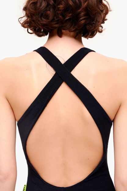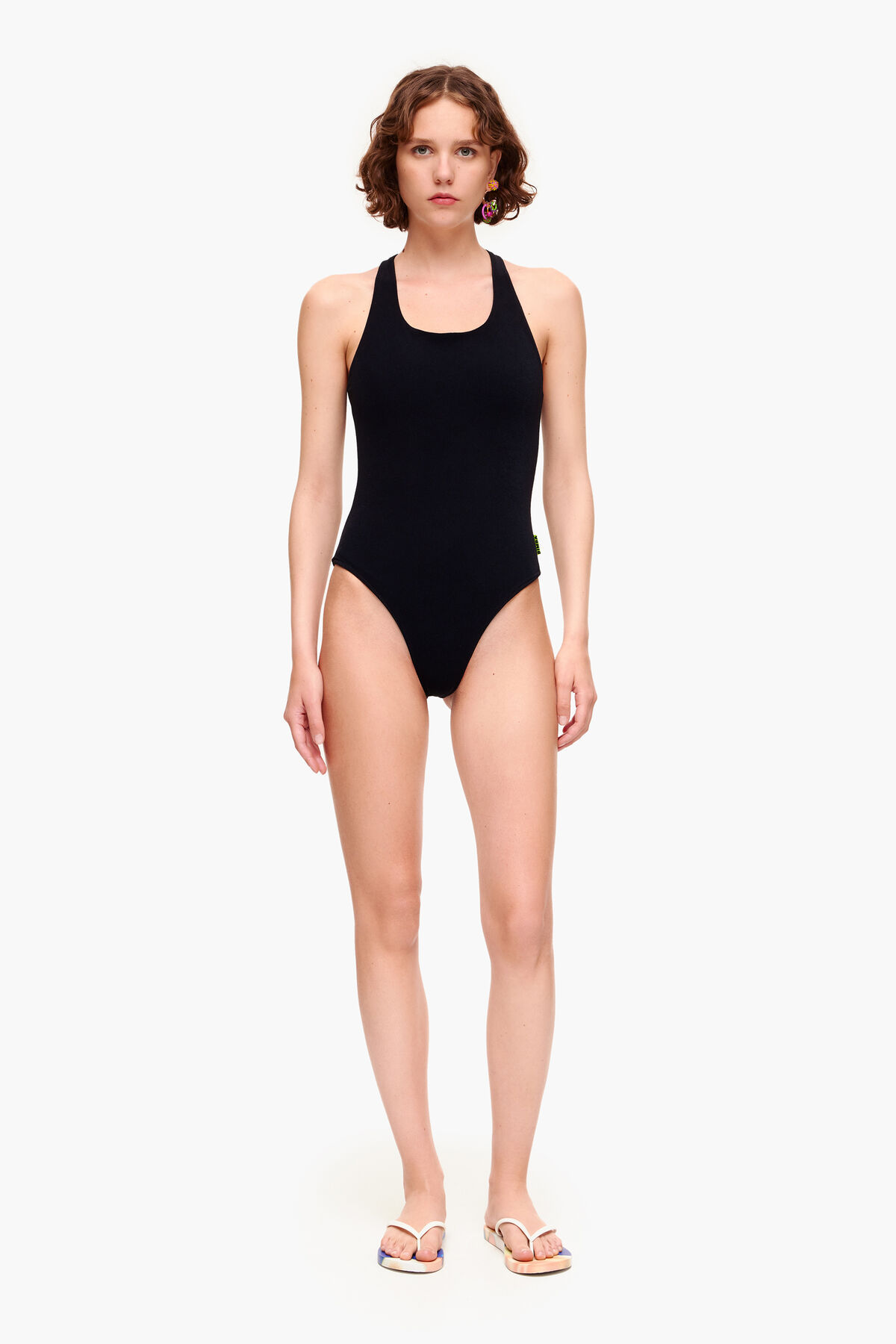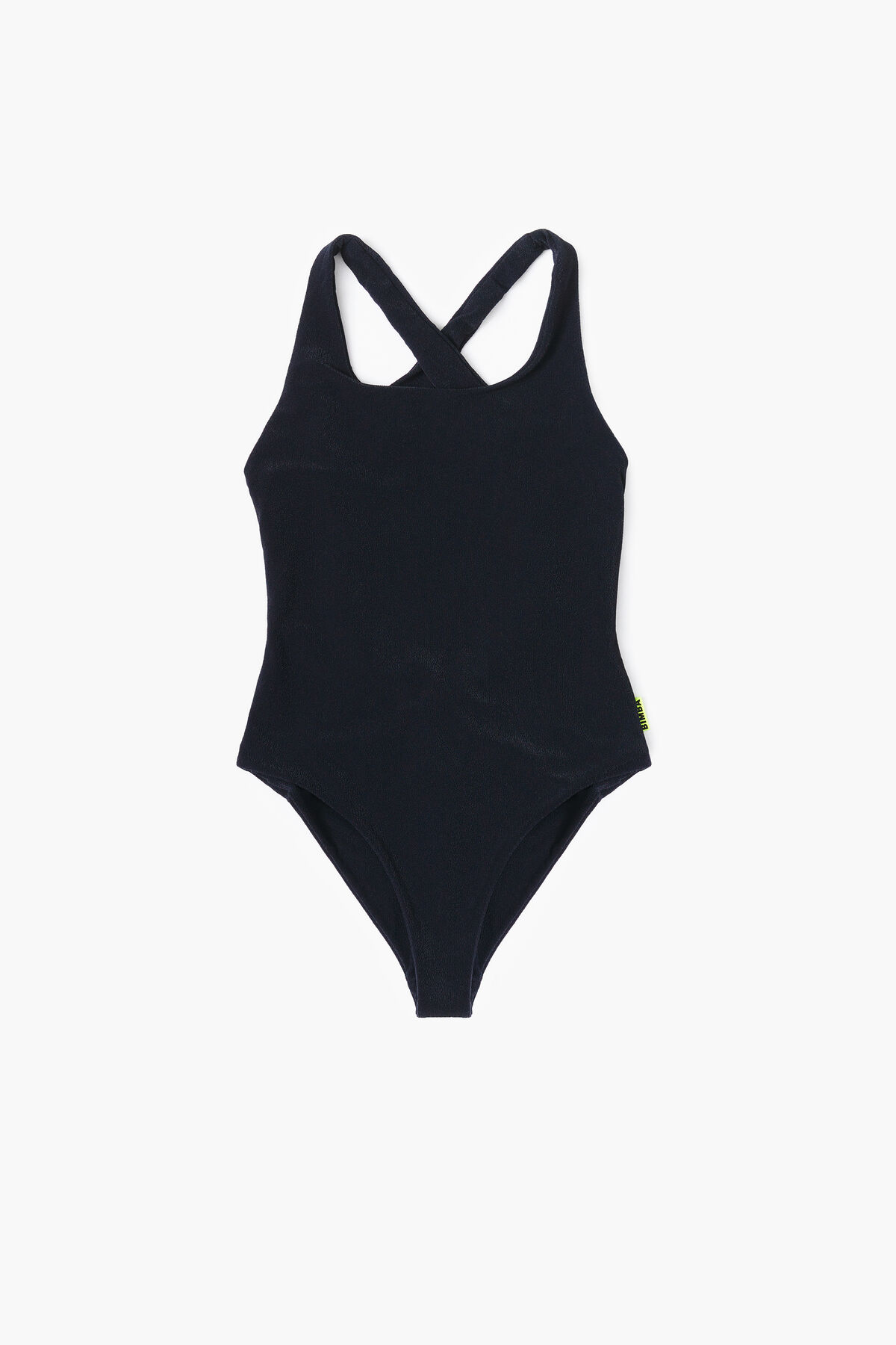 Bañador con textura de espalda cruzada en color negro. Personalizado con etiqueta Bimba y Lola en un lateral.