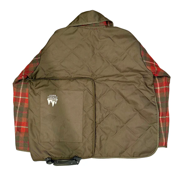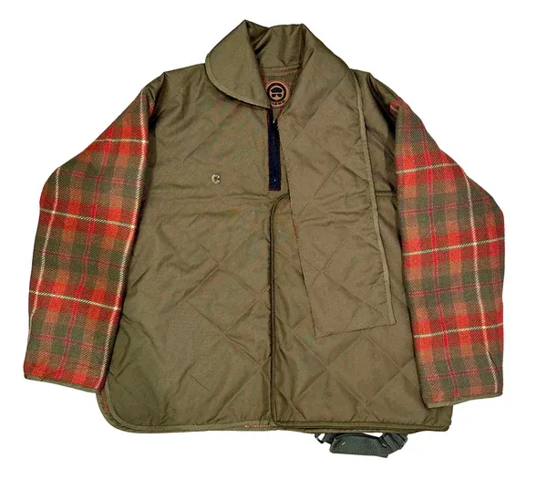 Constructed from vintage quilted fabric in an earthy field-olive, this pullover coat is shaped by clean diamond stitching that gives the surface a structured, utilitarian clarity. The sleeves introduce a contrasting red and forest-green plaid, adding warmth and a subtle nod to heritage outerwear. The interior is finished in a muted olive tone, keeping the palette cohesive and grounded. Matching olive trim frames the silhouette, and the open-front construction keeps the piece easy to wear in both functional and expressive ways. Finished with a black zipper.
